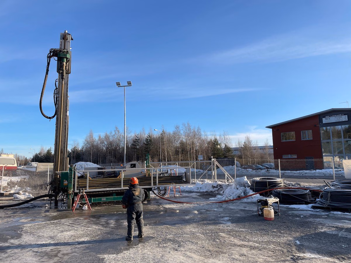 – Porasimme ensimmäisen noin 600 metrin syvyisin testikaivon omalle tontillemme Pirkkalaan viime kesänä. Testiporauksen jälkeen toteutimme keskisyvät kaivot Kalasataman kohteeseen, Juurikka kertoo.
